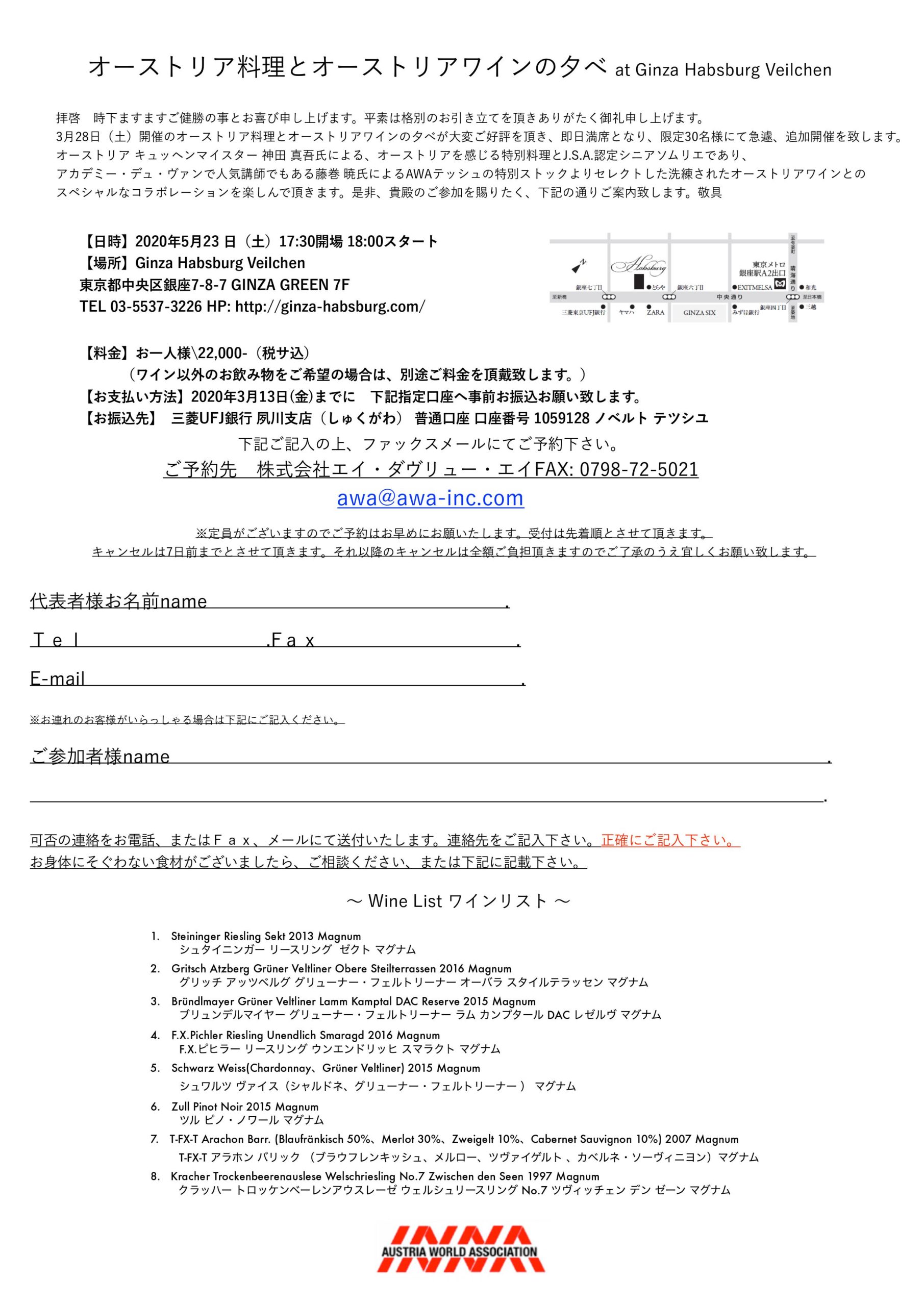 先日ご案内しました『オーストリア料理とオーストリアワインの夕べ』でございますが、お陰をもちまして満席となりました。