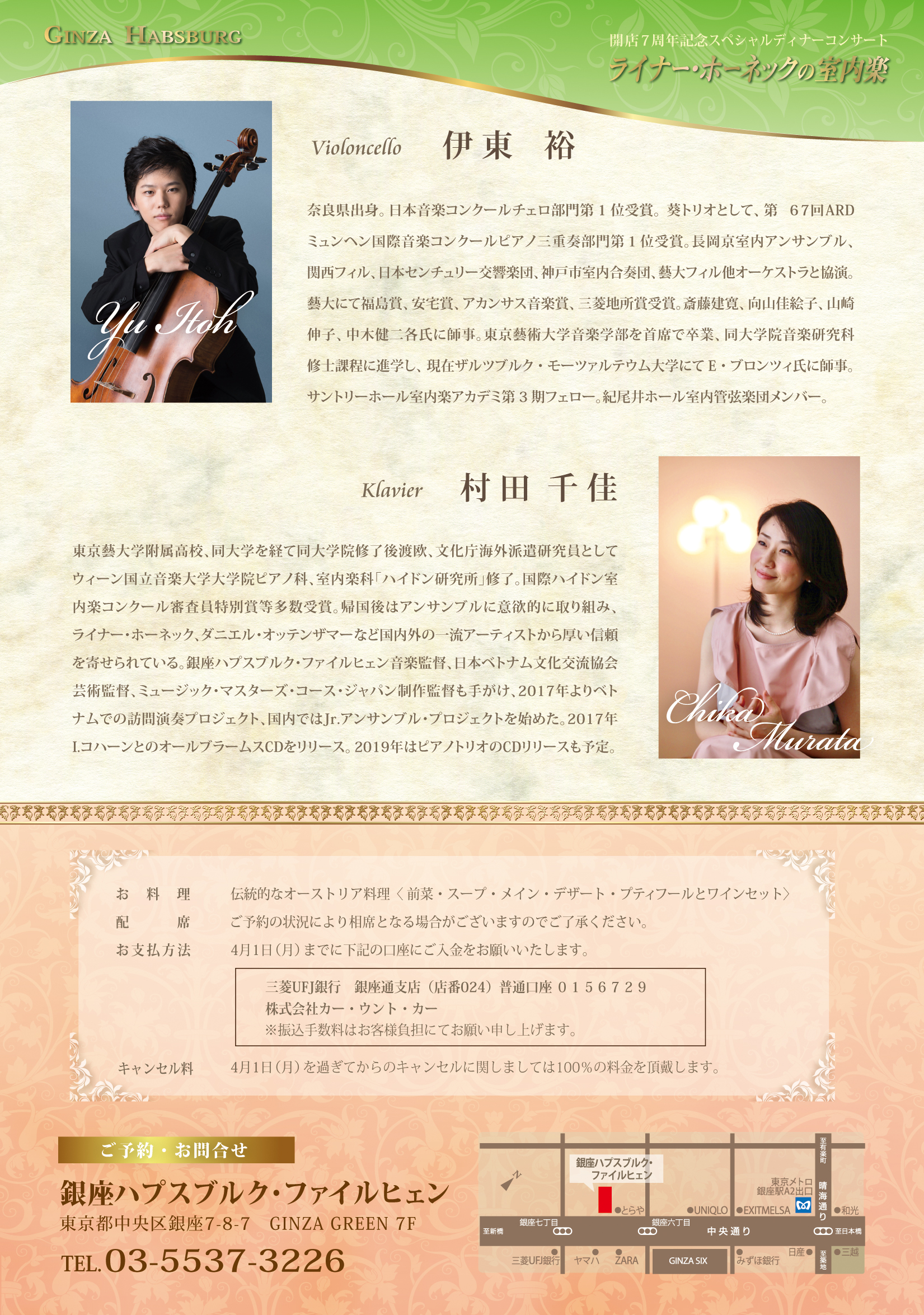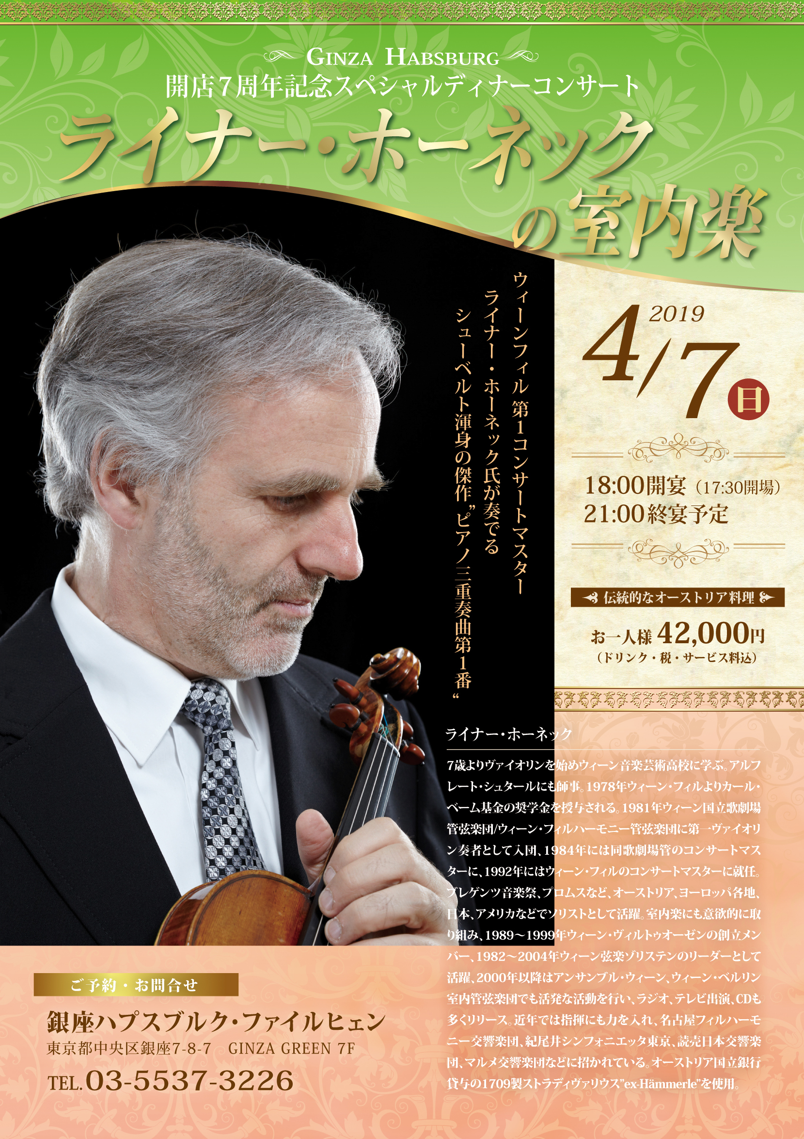 つきましては日頃の感謝を込めて ライナー・ホーネック氏(ウィーン・フィルハーモニー管弦楽団 主席コンサートマスター)、伊東裕氏(チェロ)、村田千佳氏(ピアノ)を迎えて7周年記念ディナーコンサートを開催させていただきます。